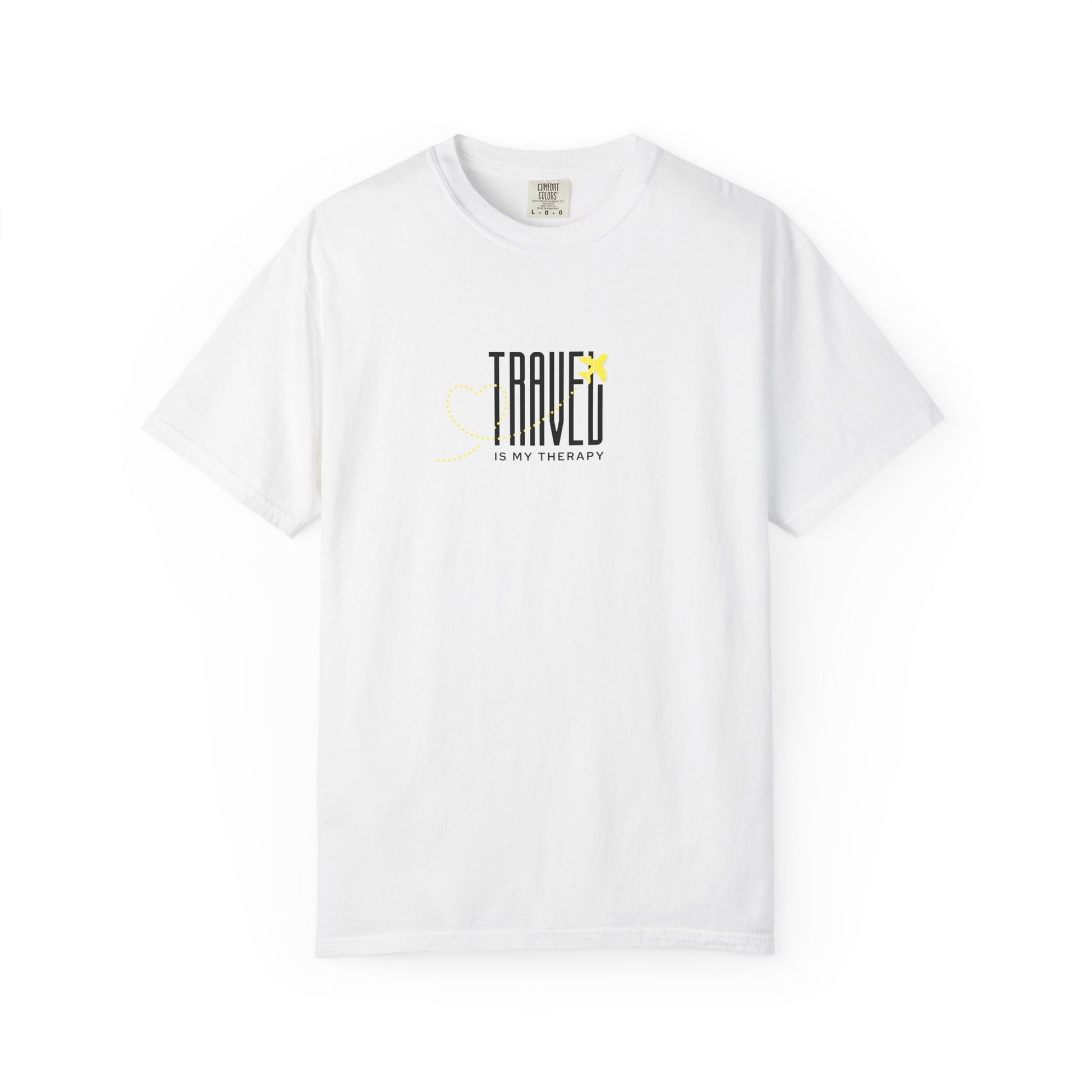 Travel is My Therapy Unisex T-Shirt | Airplane Heart Trail Wanderlust Tee | Travel Lover Gift | Yellow